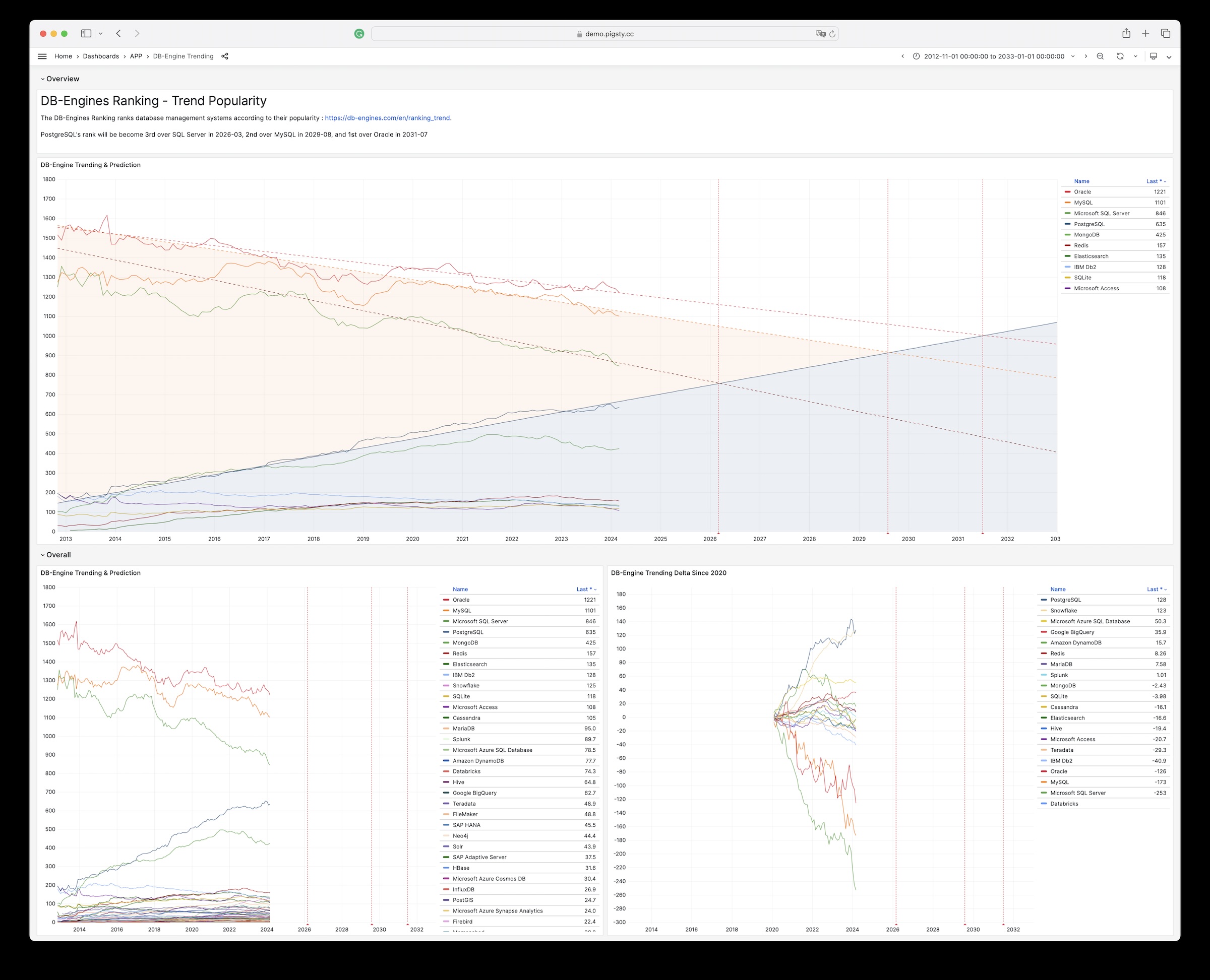 更奇妙的是,您完全可以基于 Pigsty 内置了的 Grafana 与 Postgres ,以低代码的方式快速搭建起一个交互式的数据应用来,甚至还可以使用 Pigsty 内置的 ECharts 面板创造更有表现力的交互可视化作品。