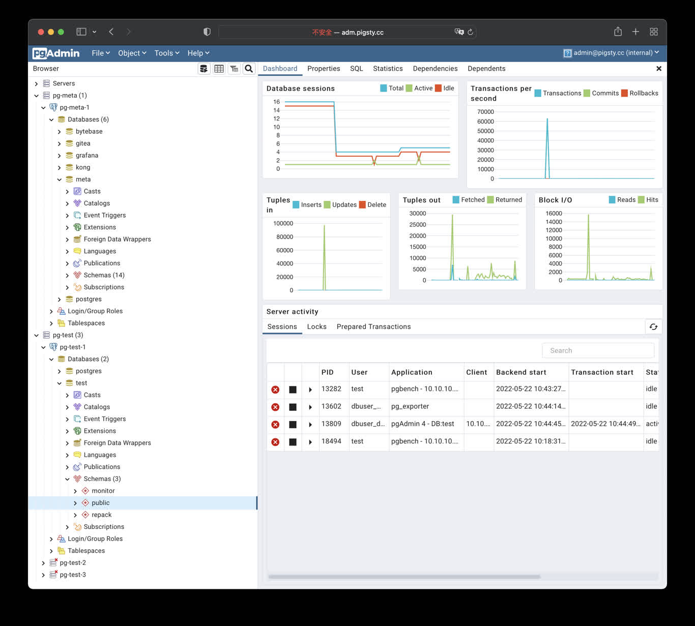 无论是故障分析还是慢查询优化、无论是水位评估还是资源规划,Pigsty 为您提供全面的数据支撑,真正做到数据驱动。在 Pigsty 中,超过三千类监控指标被用于描述整个系统的方方面面,并被进一步加工、聚合、处理、分析、提炼并以符合直觉的可视化模式呈现在您的面前。从全局大盘总览,到某个数据库实例中单个对象(表,索引,函数)的增删改查详情都能一览无余。您可以随意上卷下钻横向跳转,浏览系统现状与历史趋势,并预测未来的演变。