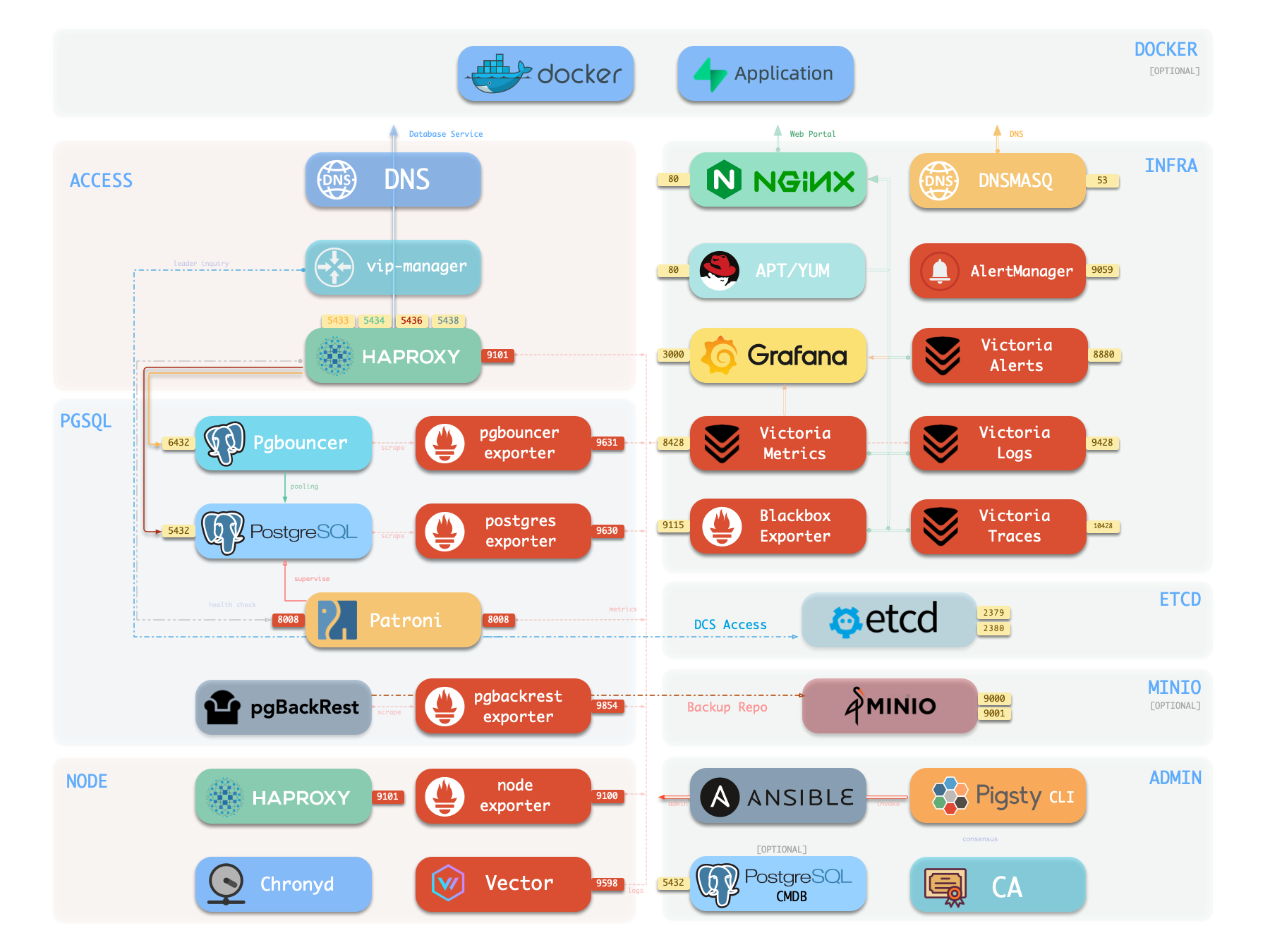 Pigsty 提供了 Docker 模块与大量开箱即用的 Compose 模板。您可以使用 Pigsty 管理的高可用 PostgreSQL (以及 Redis 与 MinIO )作为后端存储,以无状态的模式一键拉起这些软件: Gitlab、Gitea、Wiki.js、NocoDB、Odoo、Jira、Confluence、Habour、Mastodon、Discourse、KeyCloak 等等。如果您的应用需要一个靠谱的 PostgreSQL 数据库, Pigsty 也许是最简单的获取方案。