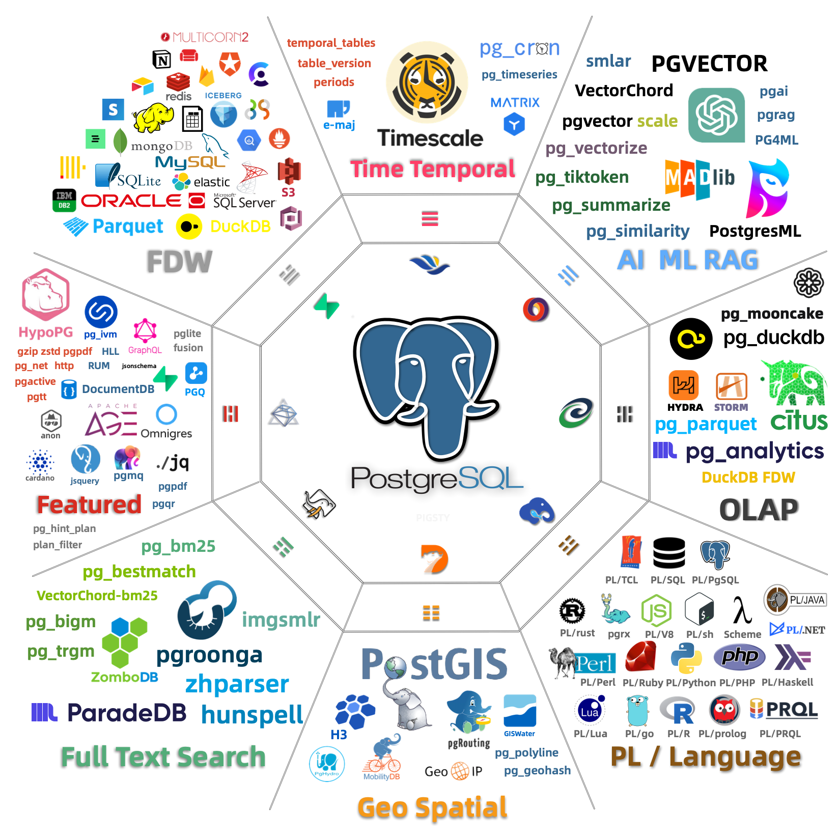 - 开箱即用的 PostgreSQL 发行版,深度整合地理、时序、分布式、图、向量、搜索、AI等 440 余个扩展插件!