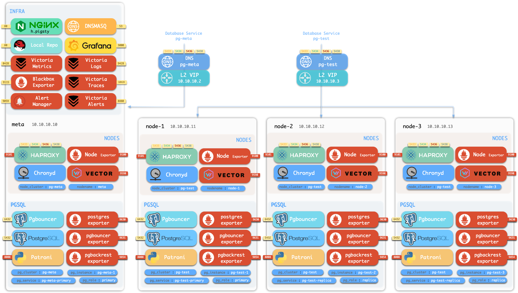 在多个节点上安装 PGSQL 模块会自动组建出基于主从复制的高可用数据库集群,而同样的 ETCD 模块则为数据库高可用提供共识与元数据存储。