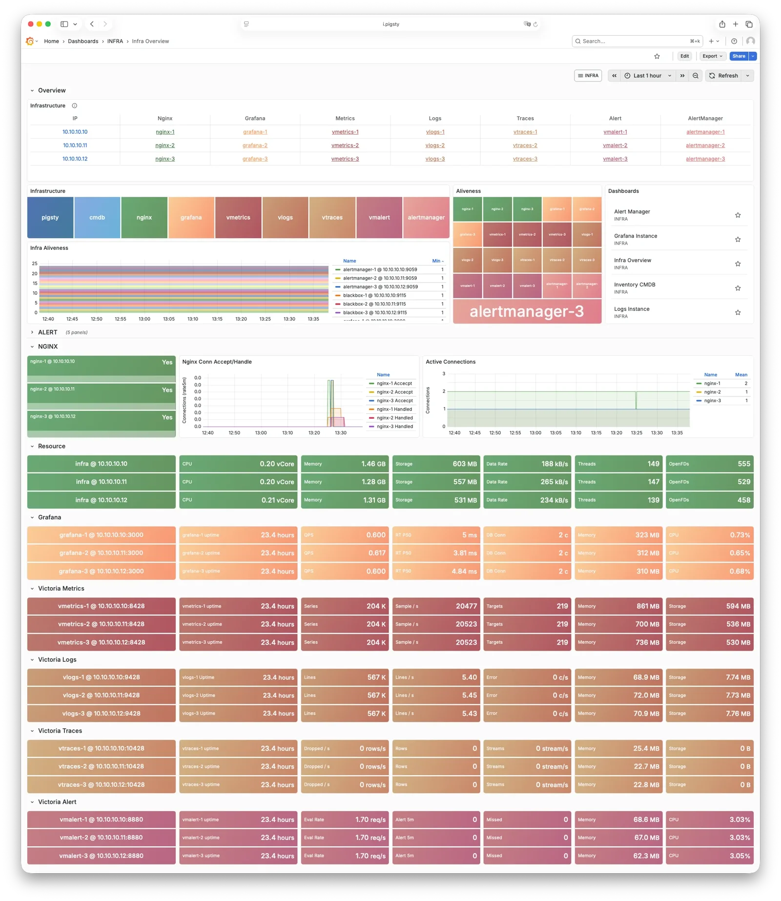 每个 Infra 节点都是 独立 的,Nginx 指向的都是本机上的服务。 VictoriaMetrics 也是独立抓取环境中所有服务的监控指标, 日志会默认推送到所有 VictoriaLogs 日志采集端点上。 唯一的例外是 Grafana,每一个 Grafana 中都会注册所有的 VictoriaMetrics / Logs / Traces / PostgreSQL 实例作为数据源。 因此每一个 Grafana 实例都能看到完整的监控数据。