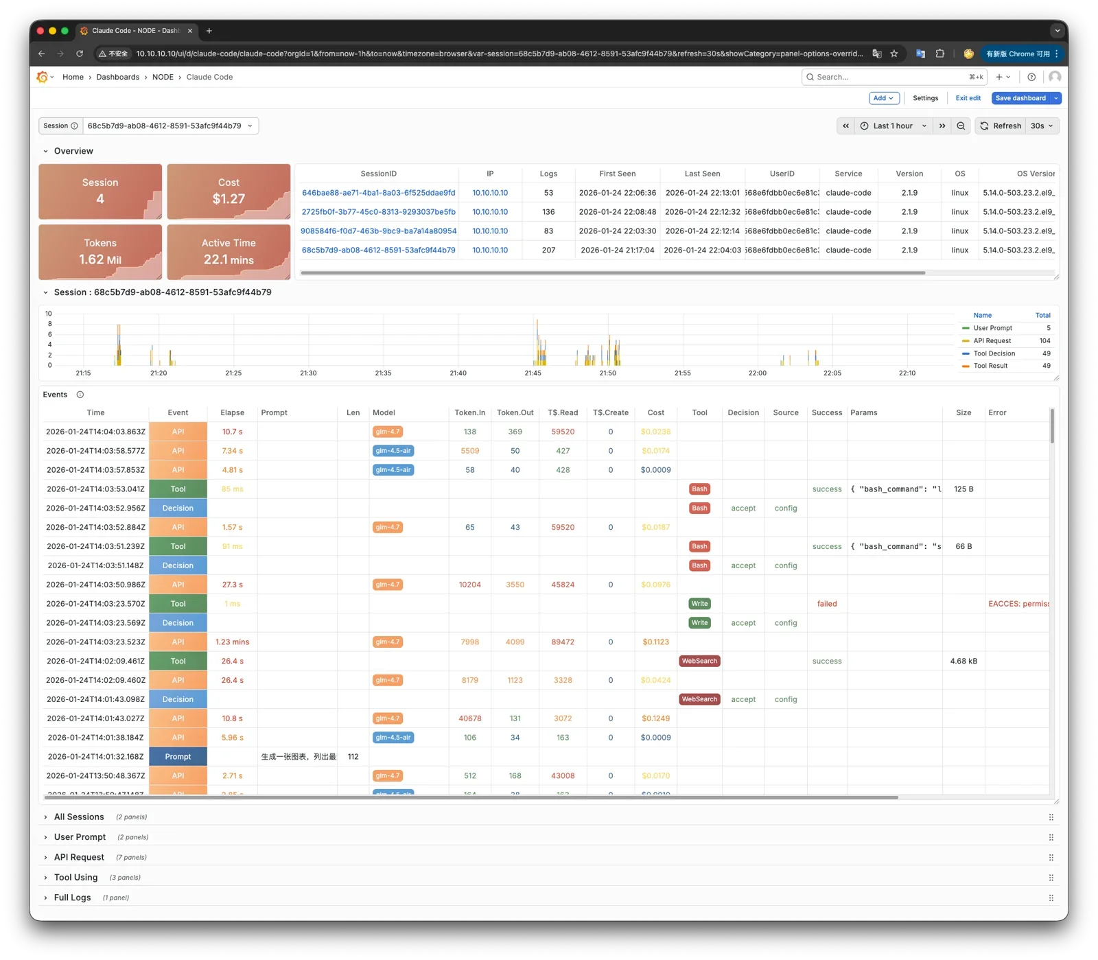 这里的 Claude 已经将日志与监控指标默认接入到 Grafana 大盘,你可以通过 Grafana 监控 Claude 的运行状态。