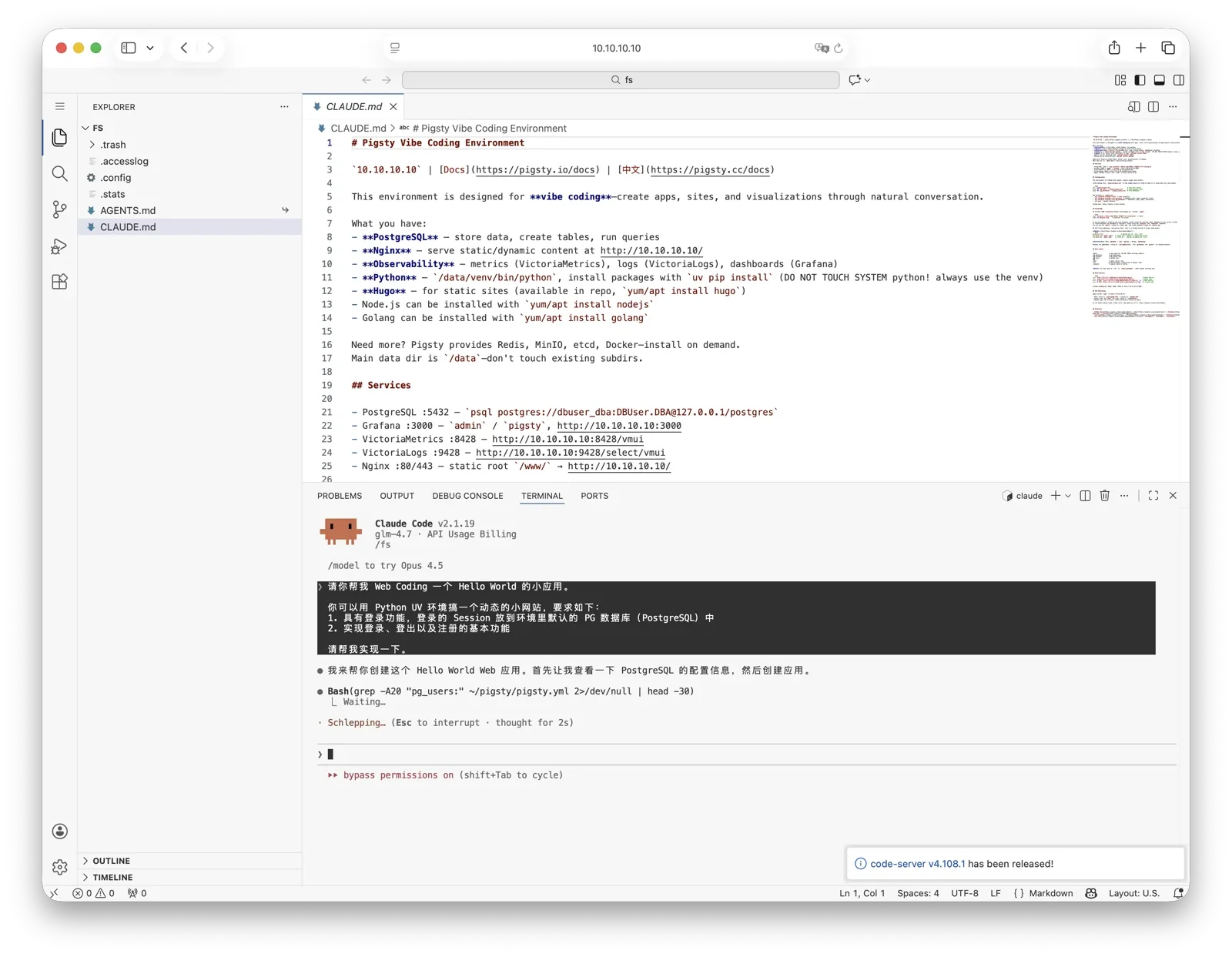 PIGLET 是基于 Pigsty 的轻量运行时环境,专为 AI Web Coding 打造的云端编码沙箱。 它将 PostgreSQL 数据库、JuiceFS 分布式存储、VS Code、JupyterLab 等工具整合为一体, 让你从 “出嘴编码” 到 “部署上线” 实现零阻力。